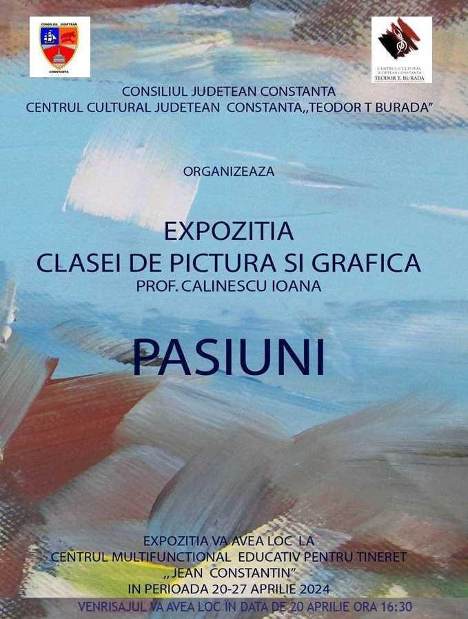 Iubitorii de artă vor avea prilejul să se delecteze, în perioada 20 -27 aprilie 2024, cu lucrările cuprinse în expoziția Clasei de Pictură și Grafică a Centrului Cultural Județean Constanța „Teodor T. Burada” - profesor coordonator Ioana Călinescu. Denumită sugestiv ,,Pasiuni’’, expoziția de grafică și pictură va avea vernisajul sâmbătă, 20 aprilie 2024, ora 16:30, în spațiul expozițional al Centrului Multifuncțional Educativ Pentru Tineret ,,Jean Constantin’’. Intrarea este liberă.