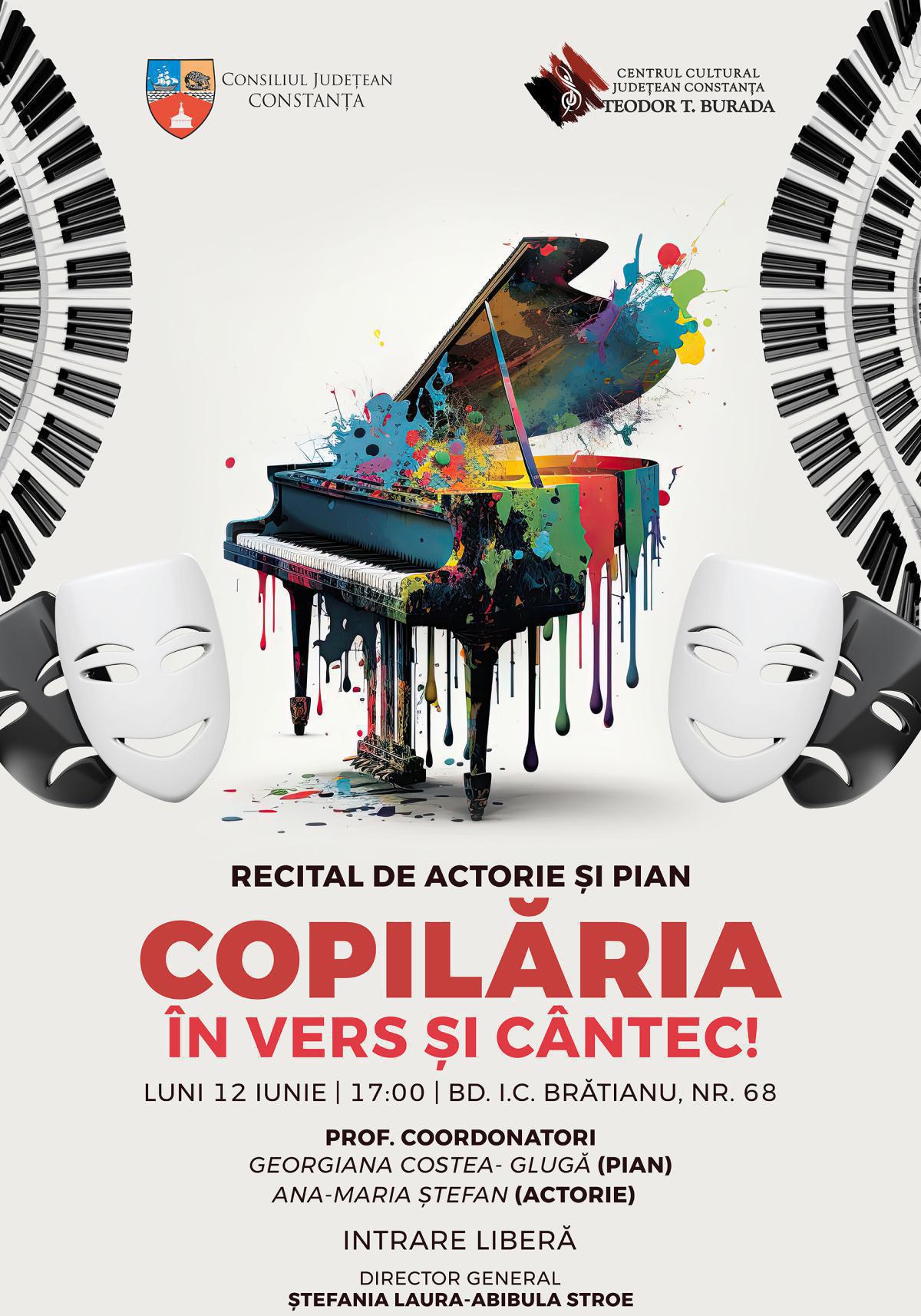 „Copilăria în vers și cântec” este titulatura sub care se va desfășura recitalul claselor de pian și actorie din cadrul Centrului Cultural Județean Constanța ,,Teodor T. Burada’’, la sediul din Bd. I. C. Brătianu nr. 68, programat luni, 12 iunie 2023, cu începere de la ora 17.00. Profesori coordonatori: Ana-Maria Ștefan (actorie) și Georgiana Costea - Glugă (pian).