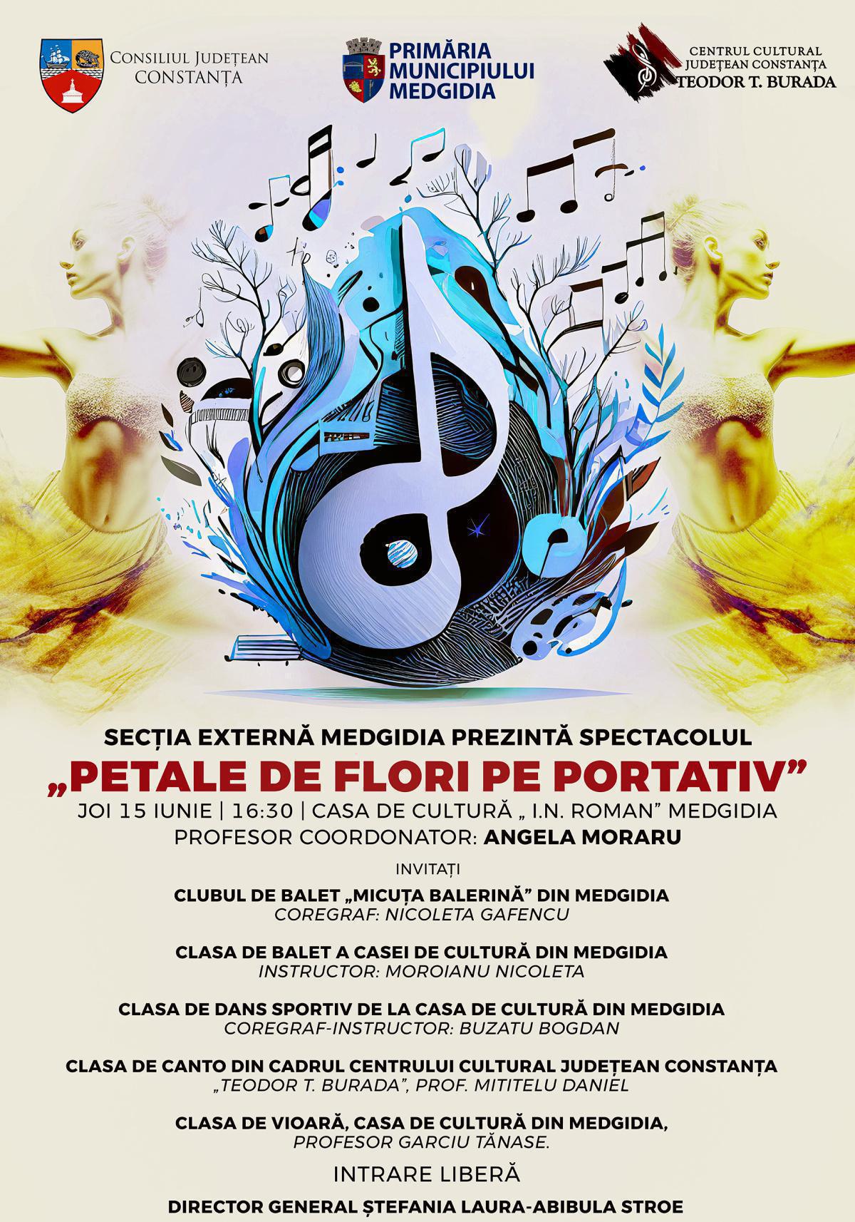 Secția Externă Medgidia va prezenta, joi, 15 iunie, de la ora 16.30, la Casa de Cultură „I. N. Roman” Medgidia, spectacolul ,,Petale de flori pe portativ’’. Prof. coordonator: Angela Moraru. Invitați vor fi: Clubul de Balet ,,Micuța Balerină’’ din Medgidia, coregraf: Nicoleta Gafencu; Clasa de Balet a Casei de Cultură din Medgidia, instructor: Nicoleta Moroianu; Clasa de Dans Sportiv de la Casa de Cultură din Medgidia, coregraf-instructor: Bogdan Buzatu; Clasa de Canto din cadrul Centrului Cultural Județean Constanța ,,Teodor T. Burada’’, profesor: Daniel Mititelu; Clasa de Vioară, Casa de Cultură din Medgidia, profesor: Tănase Garciu.