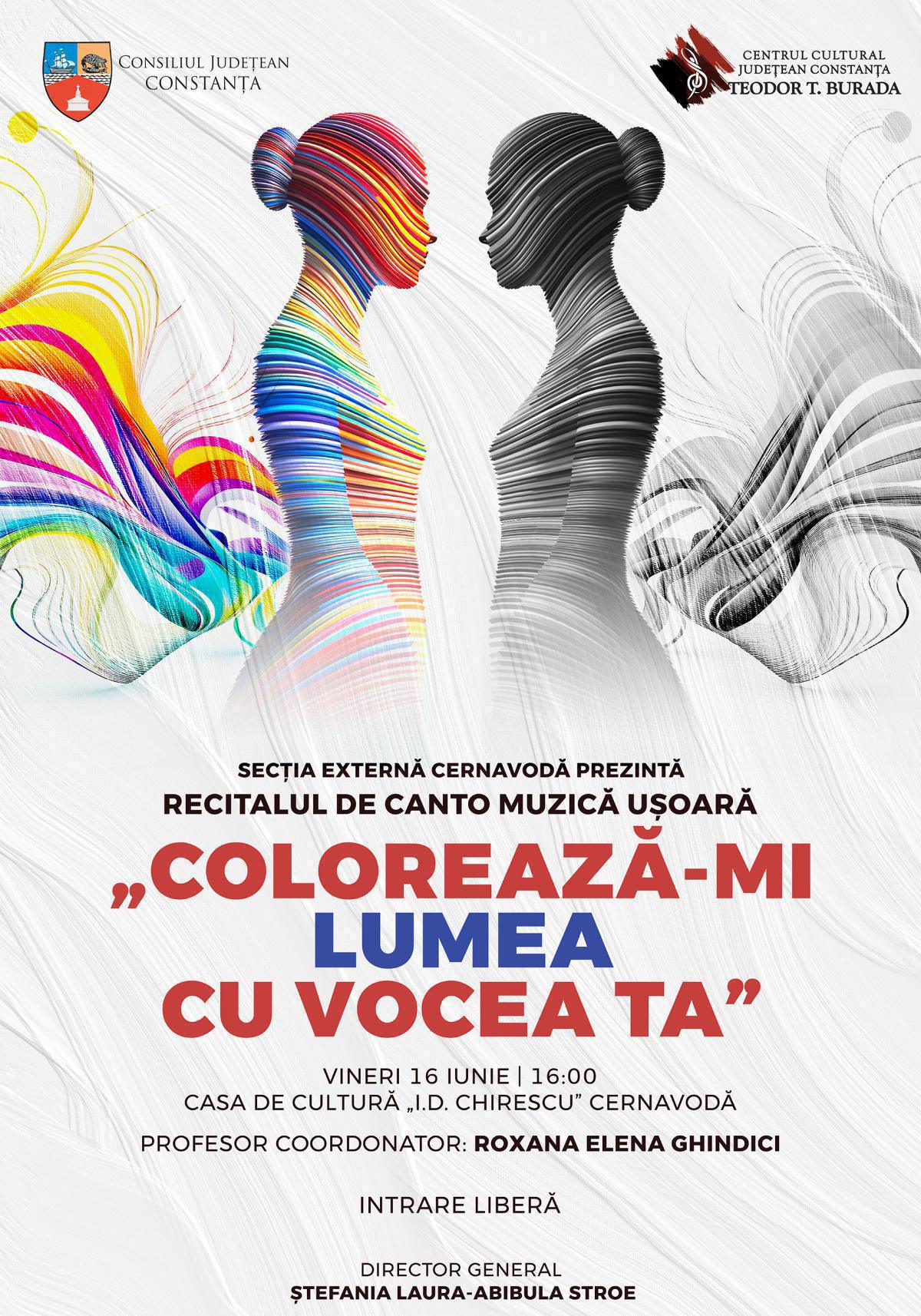 Secția Externă Cernavodă a pregătit pentru vineri, 16 iunie, ora 16.00, la Casa de Cultură ,,I. D. Chirescu’’, recitalul de Canto Muzică Ușoară ,,Colorează-mi lumea cu vocea ta’’. Profesor coordonator: Roxana Elena Ghindici.