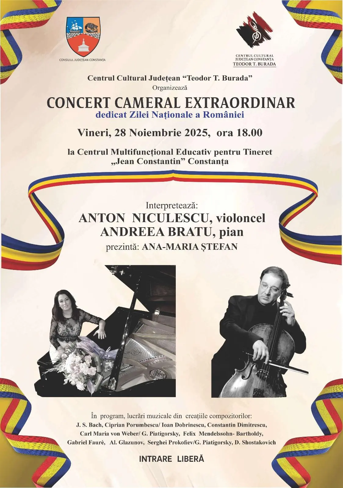 Centrul Cultural Județean „Teodor T. Burada” organizează un eveniment de prestigiu cu ocazia Zilei Naționale a României: Concert Cameral Extraordinar, o celebrare a identității și culturii române prin rafinament artistic și virtuozitate.