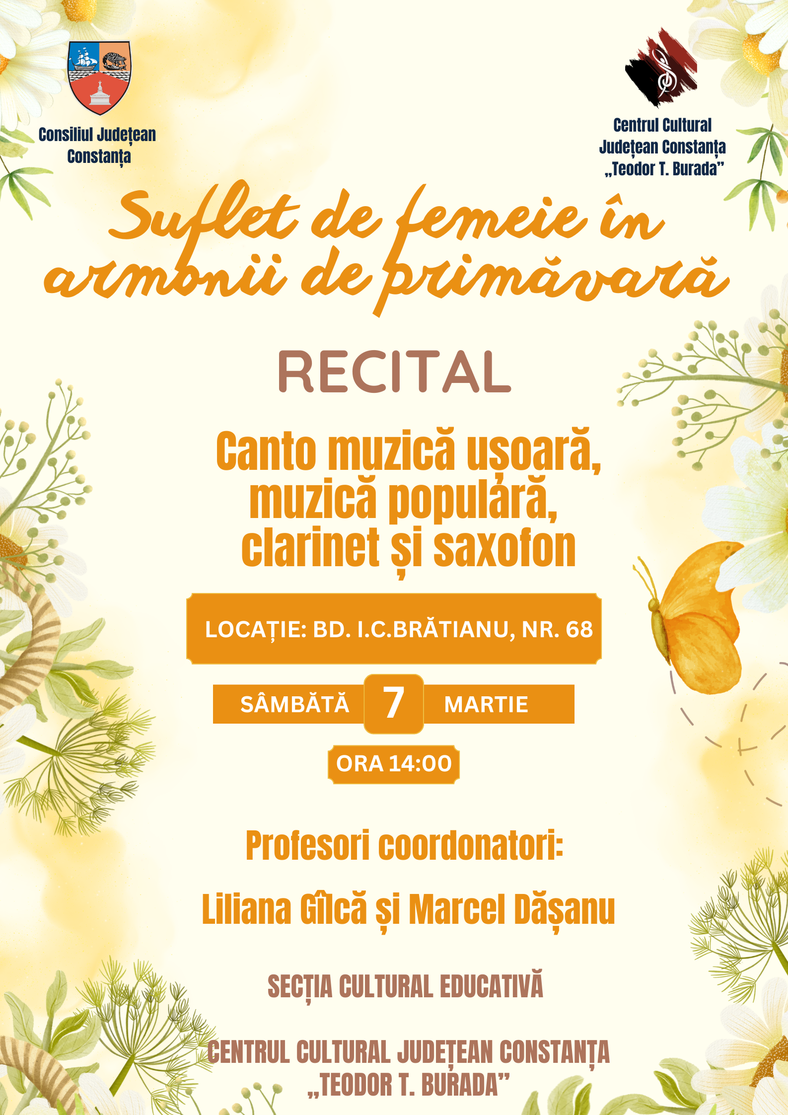 Suflet de femeie în armonii de primăvară: Recital de canto muzică ușoară, muzică populară, clarinet și saxofon